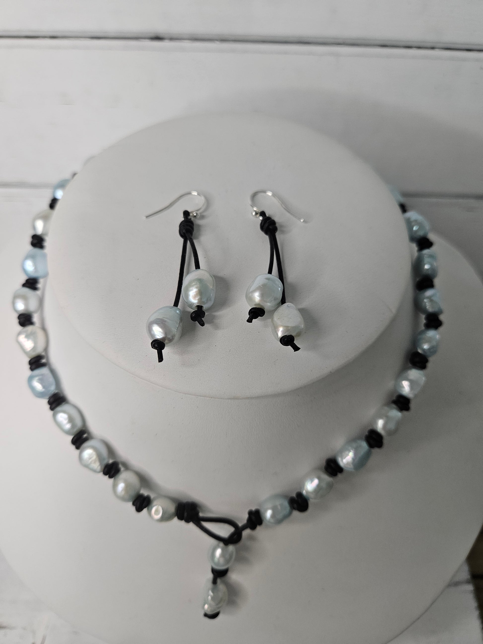 Leather and Freshwater Baby Blue Baroque Pearl Knotted Necklace and matching Earring Set