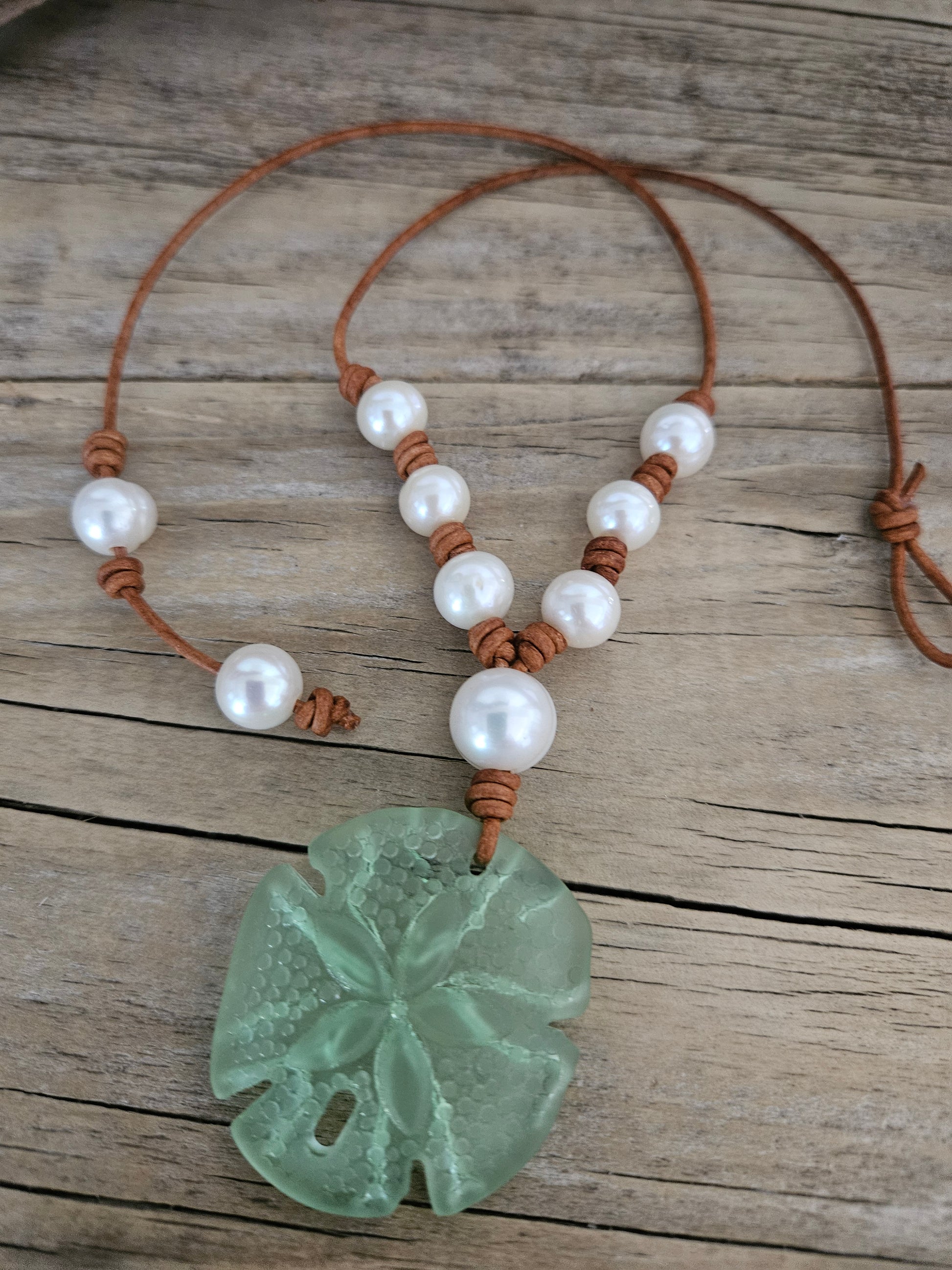 Boho Pearl Necklace: Green Sand Dollar Leather Pendant, Resort Jewelry