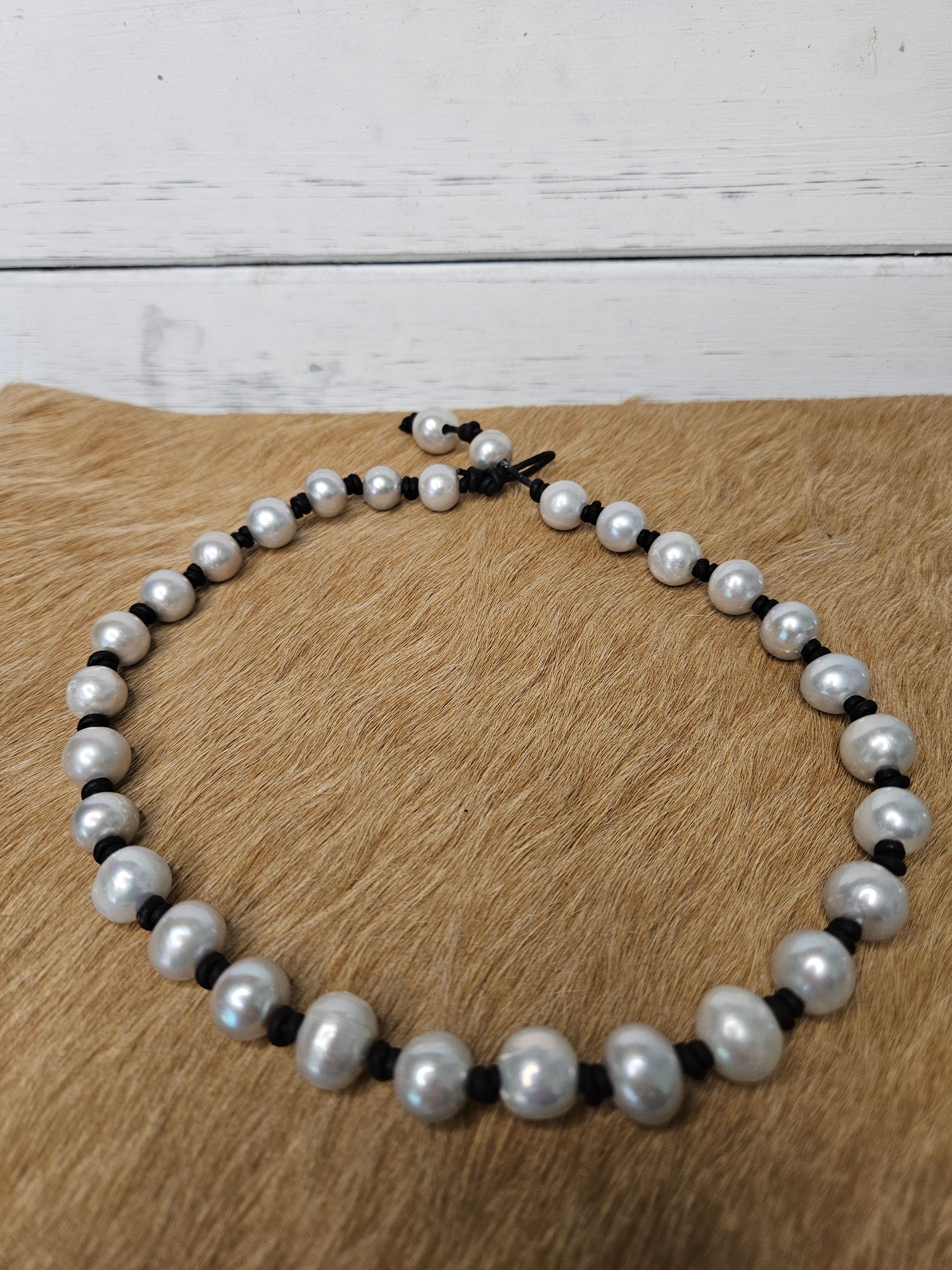 Silver-Gray Freshwater Pearl Necklace: Knotted Leather, Minimalist Boho